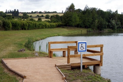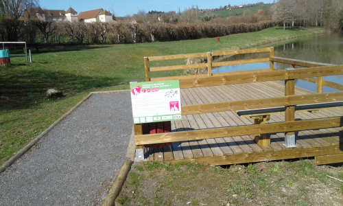 En 2011, une première installation a remplacé l'équipement sommaire d'origine pour offrir 2 places de pêche sécuriées surplombant l'étang et muni d'un banc et d'une rembarde (première photo ci-contre).